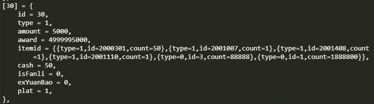 充值后VIP界面领取的物品itemid={{type=1,id=2005001,count=1},{type=1,id=1004011,count=1},{type=1,id=1004031,count=1},{type=1,id=2000103,count=10},{type=0,id=3,count=888},{type=0,id=1,count=888000},{type=0,id=2,count=9000}},